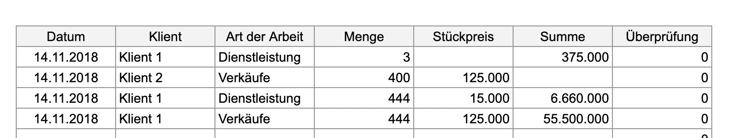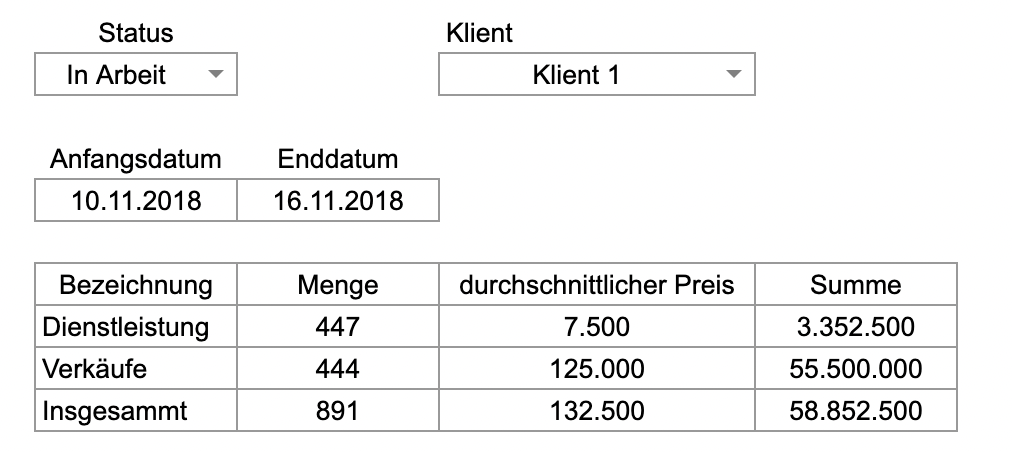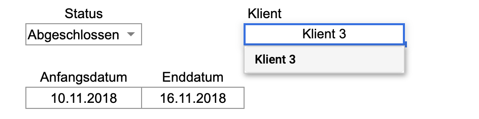 Ansicht der Tabelle vom Chef. Die Aufgabe wird dadurch erschwert, dass die Darstellung der Daten in der Tabelle des Chefs durch verknüpfte Dropdown-Listen und Datumsbereiche definiert wird.