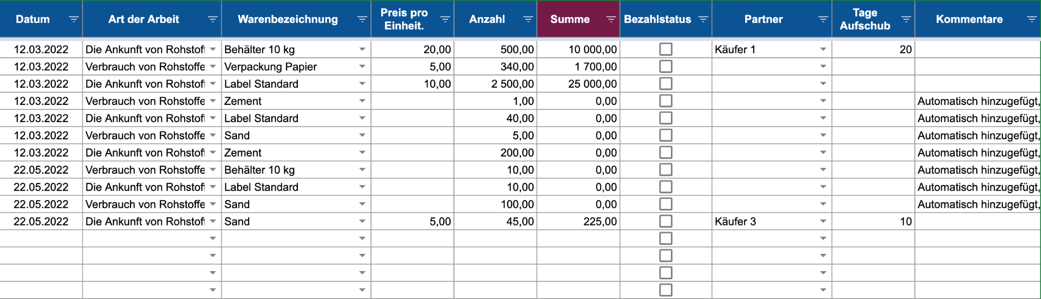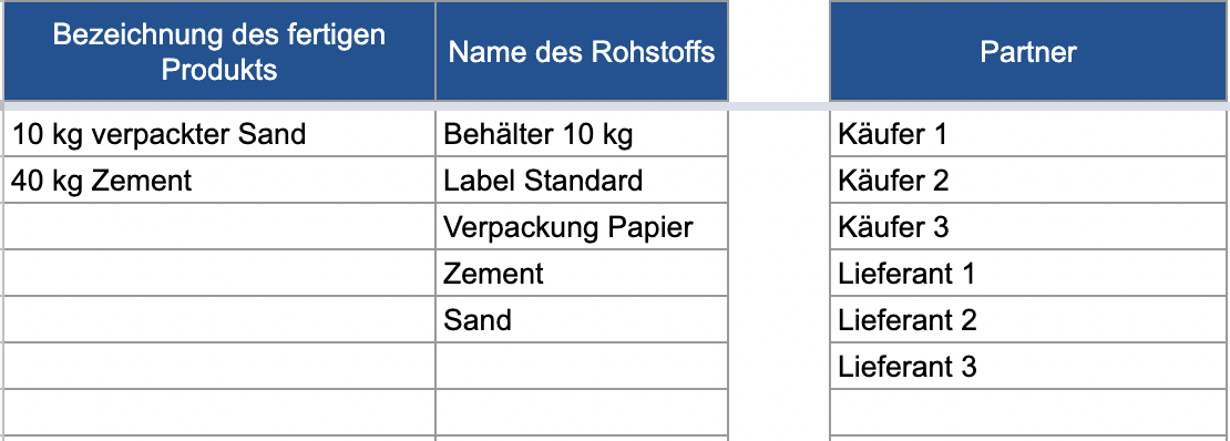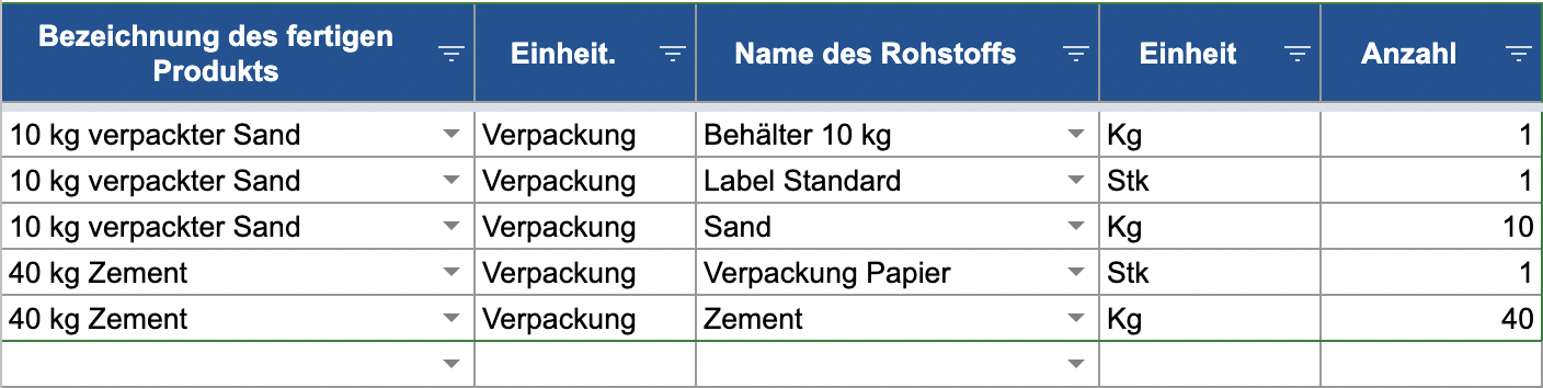 Die Namen der fertigen Produkte und Rohstoffe werden aus der Dropdown-Liste ausgewählt.